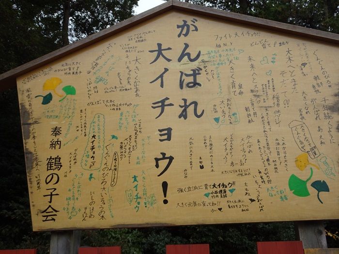 「がんばれ大イチョウ」の木札には子供達の様々な想いの書き込みが。