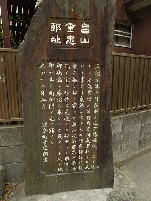 畠山重忠邸址の石碑は、鶴岡八幡宮の流鏑馬馬場の東の鳥居を出たところに建てられていた。