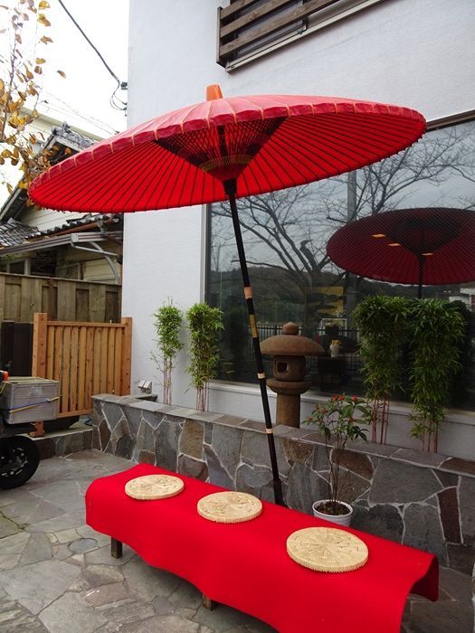 店の前庭の休憩場所には真っ赤な大きな蛇の目傘が。