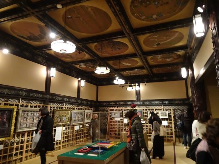 四季の花鳥画が描かれている。 黒漆の螺鈿細工が随所に見られる重厚な造りの部屋。