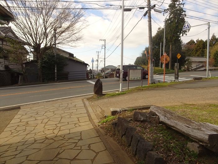 下の写真で、右側が国道、真直ぐ進むと駐車場、その手前の石畳を左に入って行くのが旧街道。