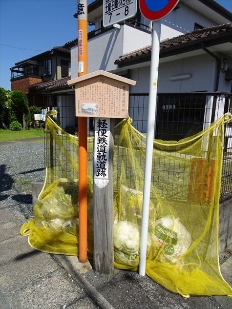 しばらく歩くと右手の路地入口にあったのが『軽便鉄道軌道跡』。