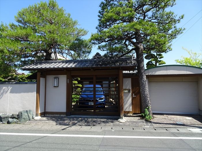 邸宅の角にあった石造りの庭。その横には大きな駐車場が。