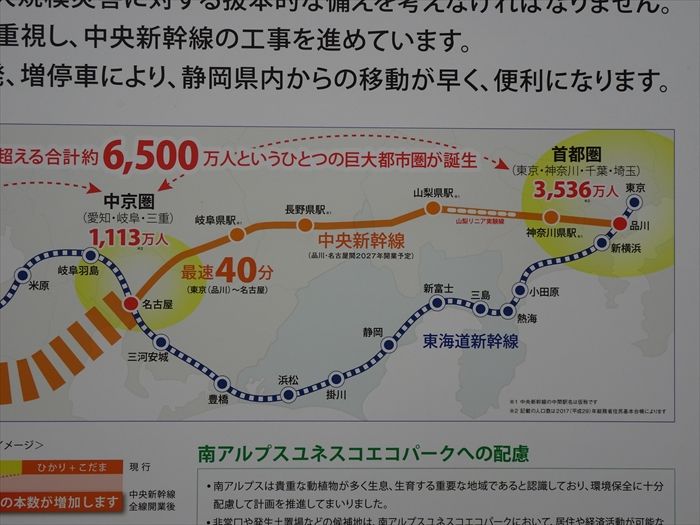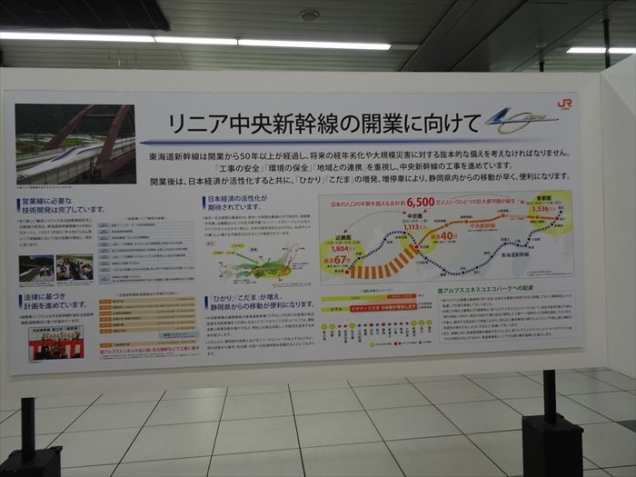 駅の中央通路には、『リニア中央新幹線の開業に向けて』のパネル展示が。