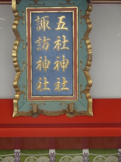 朱の大鳥居の扁額『五社神社 諏訪神社』。