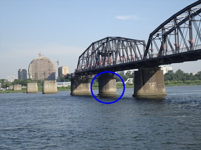 『鴨緑江断橋』の最先端の橋脚の一つ手前の橋脚は楕円形ではなく真ん丸なのであった。