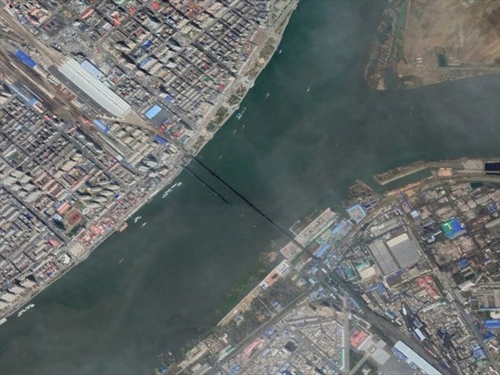 中央に上から「中朝友誼橋」と「鴨緑江断橋」が。