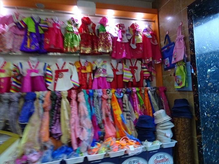 クルージング乗り場に向かう途中の店には朝鮮のチマチョゴリが土産に売られていた。