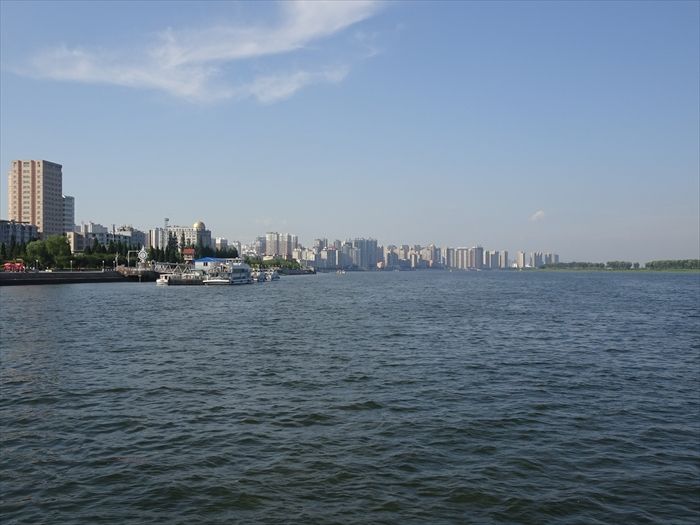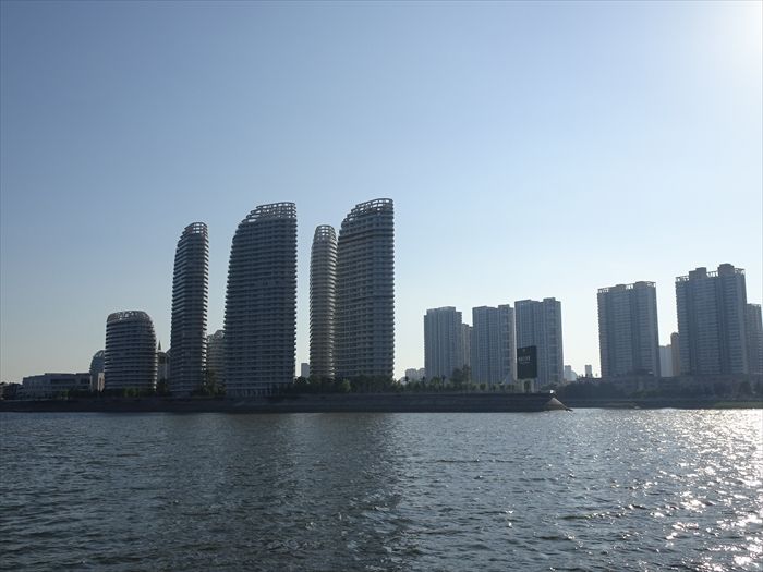 対岸の中国・丹東市の高層ビル群。