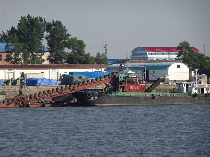 川底から砂を採取する船か?