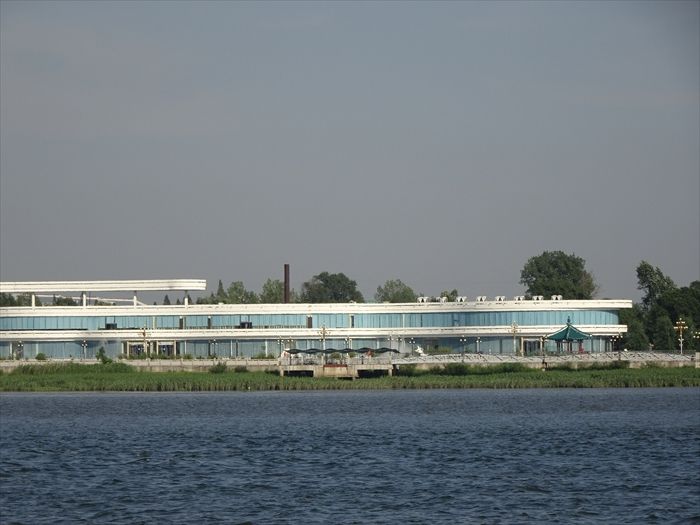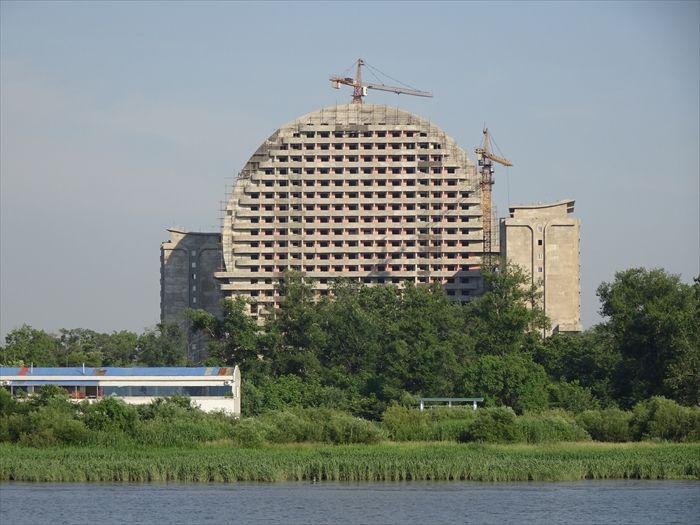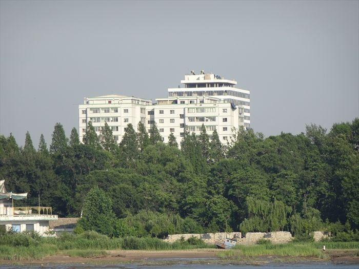 北朝鮮側のこの円形のやや高層の建築中?の建物はホテルなのであろうか?
