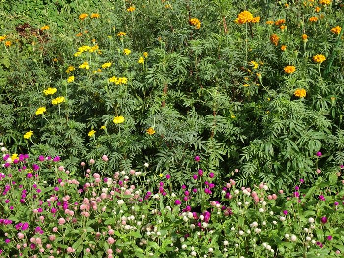 遊歩道沿いには、マリーゴールドや手前は千日紅であろうか。