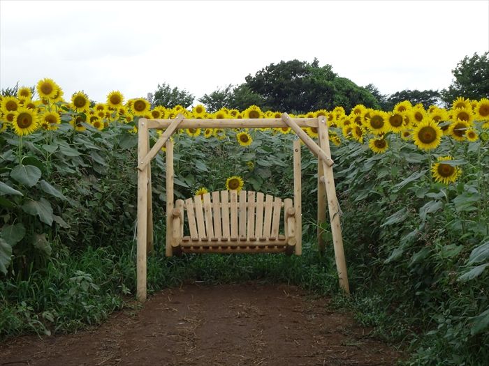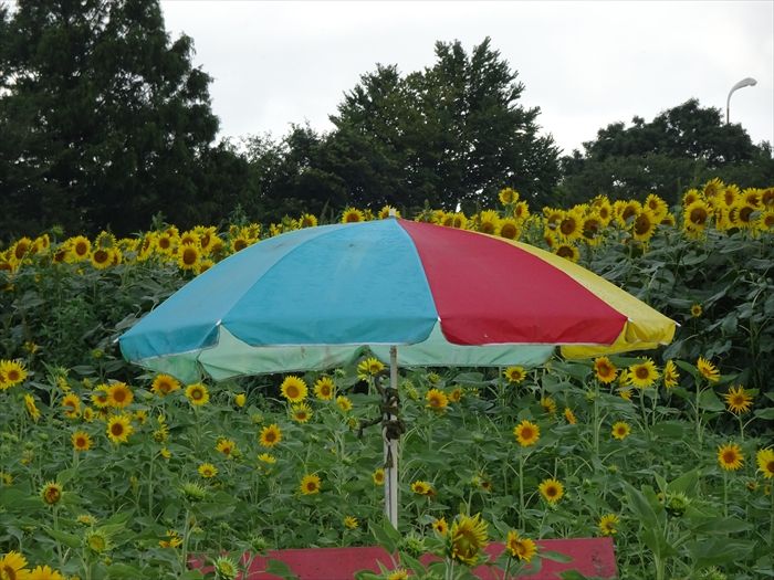 ひまわり畑の中にはカラフルなパラソル、そして赤いベンチが。