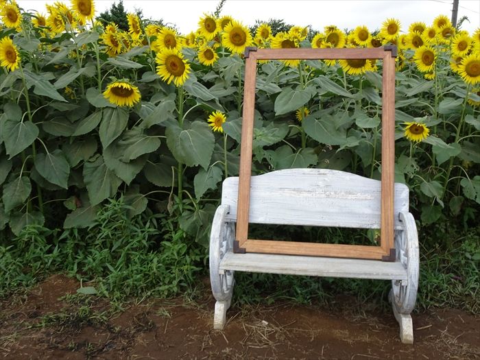 記念撮影用のベンチと額が置かれていた。