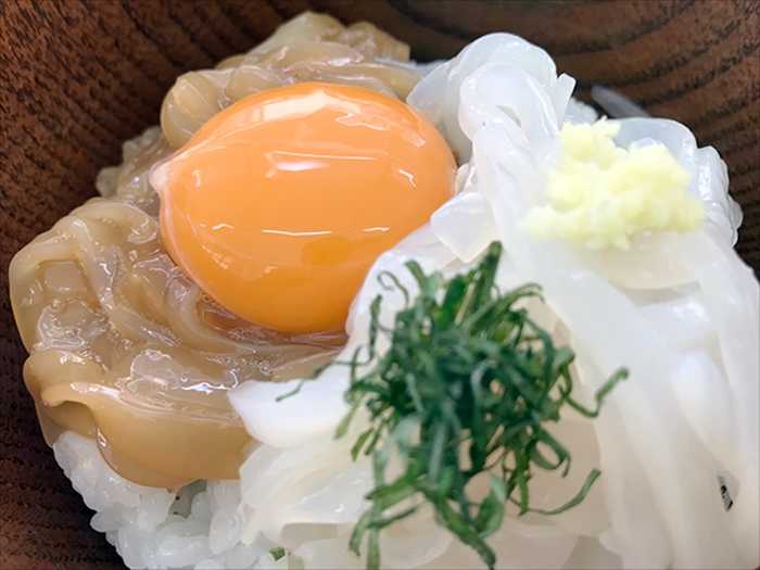 これに醤油をちょっと垂らし、イカと黄身とショウガを混ぜてご飯と一緒に。
