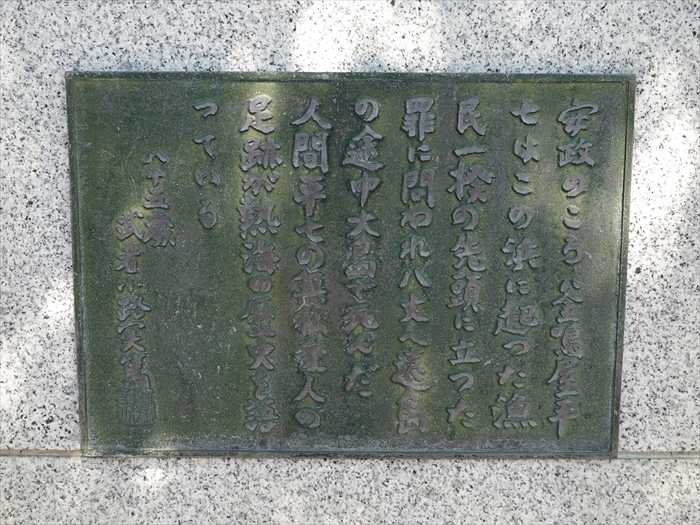 「安政のころ、釜鳴屋平七はこの浜に起こった漁民一揆の先頭に立った罪に問われ八丈島へ