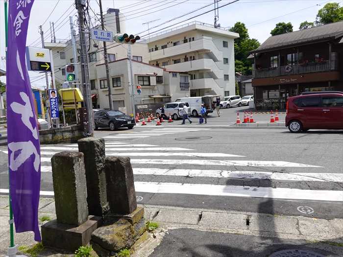 「金沢街道」の「岐れ路」交差点に出ると角に石碑が3基。