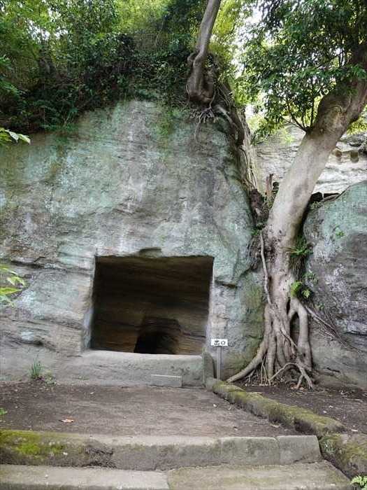英勝寺の山門横の崖に掘られた洞窟、三霊社権現。