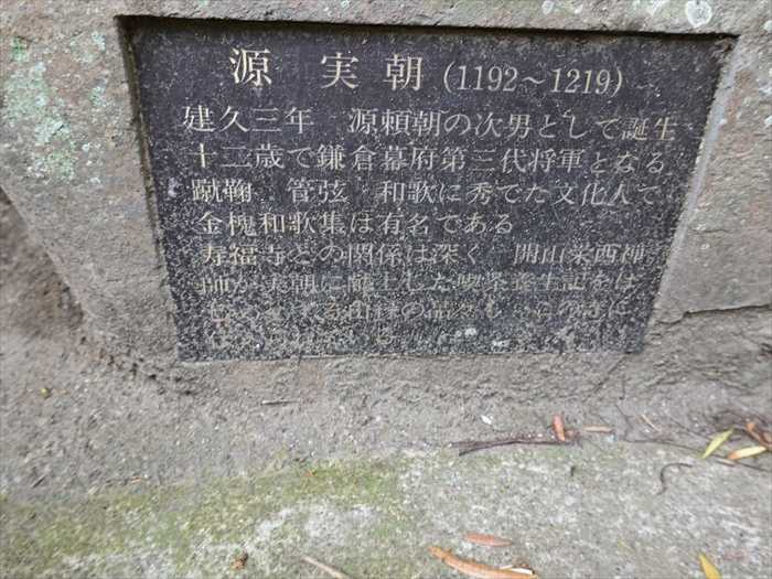 実朝の事蹟を表面下部に銅版を貼り、之に碑文を記し、裏面には寿福寺前住職