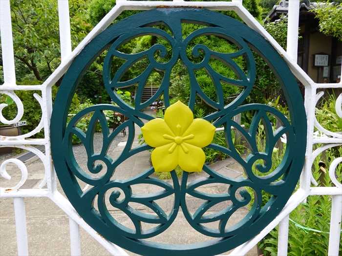 通用門・入口は女性らしさを感じる花のモチーフがあしらわれた白のゲートが。