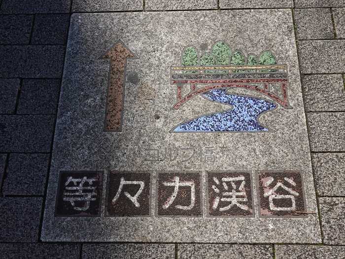 歩道上にも「ゴルフ橋 等々力渓谷」案内石板が埋め込まれていた。