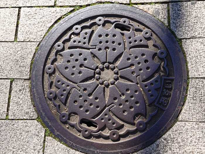 マンホール蓋のデザインは「桜(都の花)、イチョウ(都の木)」