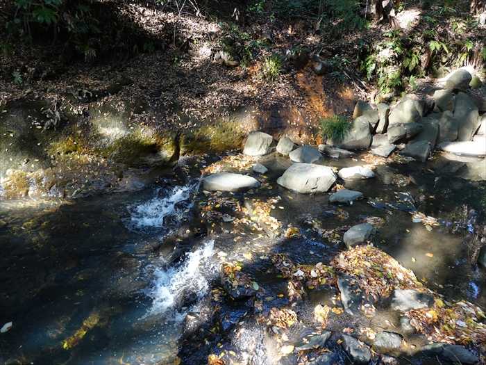 階段をおりれば、たちまち木に囲まれた小さいくて幅も狭い谷沢川が。
