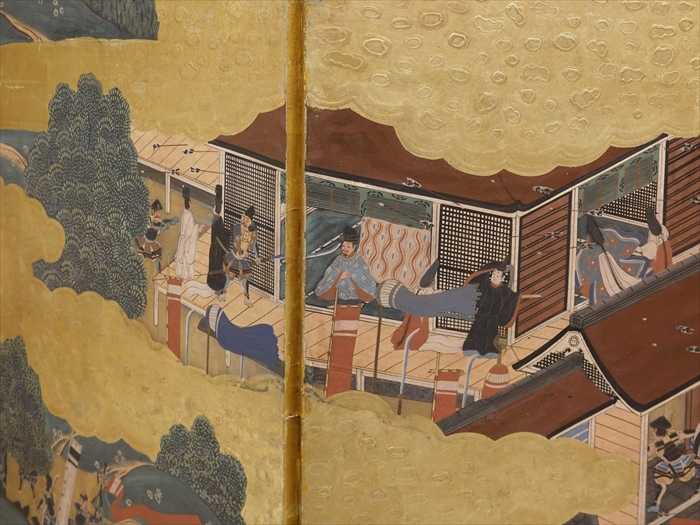 右隻に一ノ谷合戦図を、左隻に屋島合戦図・壇ノ浦合戦図を金地に極彩色と金雲で鮮やかに描き、