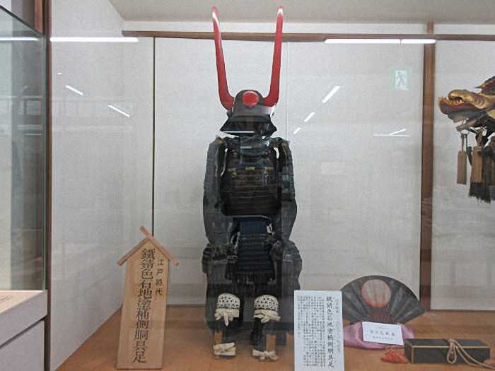 兜は鉄黒漆日根野頭成兜鉢でしころは鉄板物黒漆塗五段紺絲懸威である。前立は朱漆塗日の丸で