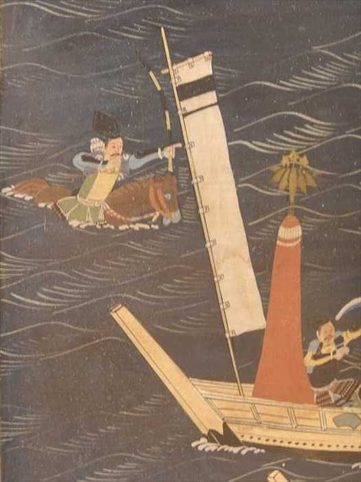 与ーは、海に馬を入れると、弓を構え見事に扇の柄を射抜いた。