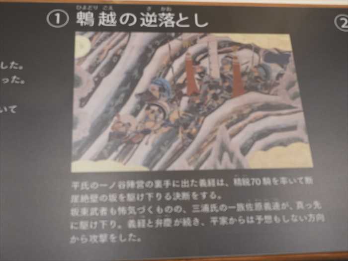平氏の一ノ谷陣営の裏手に出た義経は、精鋭70騎を率いて断崖絶壁の坂を下りる決断をする。