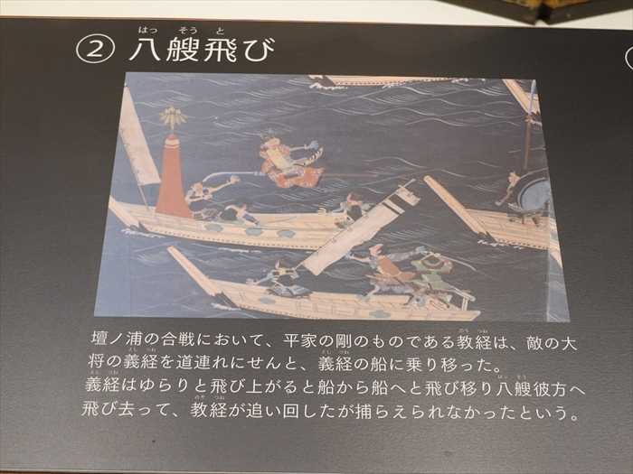 義経はゆらりと飛び上がると船から船へと飛び移り八艘彼方へ飛び去って、教経が追い回したが