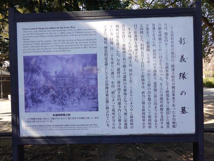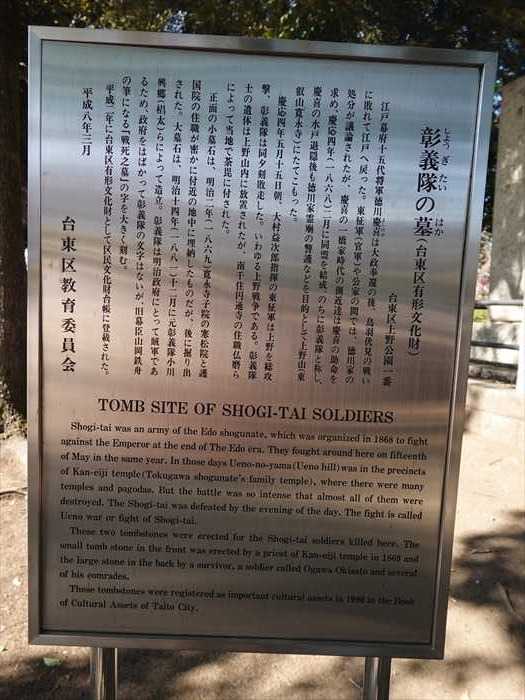 あり隊士の遺体の火葬場となった当地に彰義隊戦士の墓を建立した。なお、遺骨の一部は