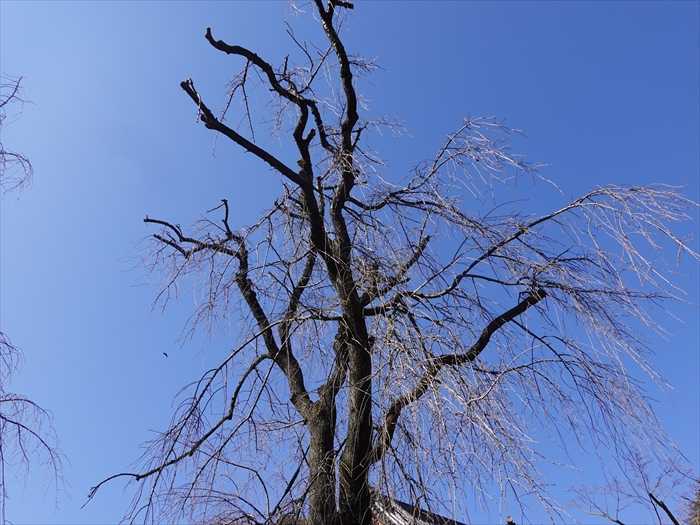 春を待つ桜の古木の根元にちょこんと可愛らしい行燈。