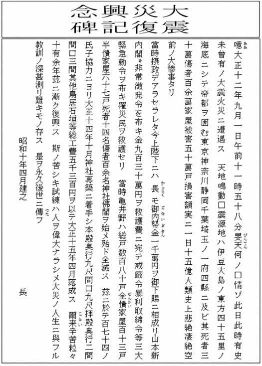 復興ス 斯ノ苦シキ試線ハ人ヲ偉大ナラシメ大災ノ人生ニ與フル教訓ノ深甚測リ難キモノ存ス