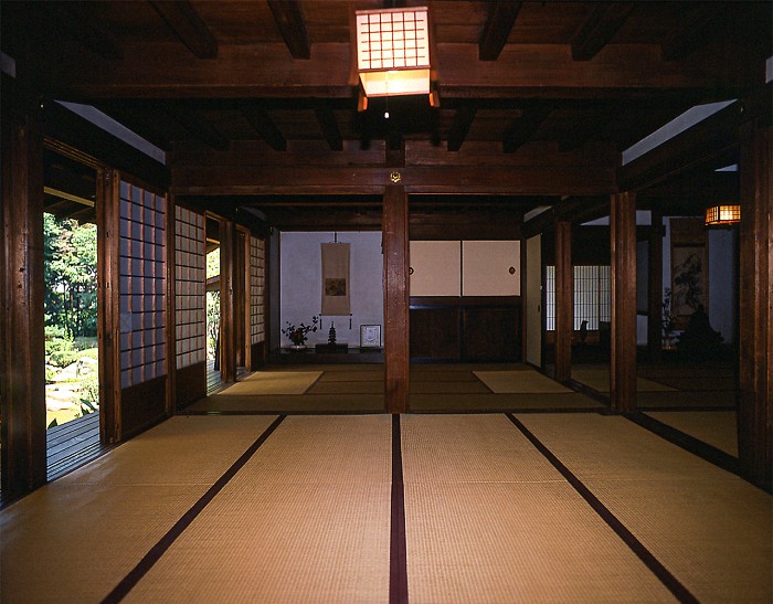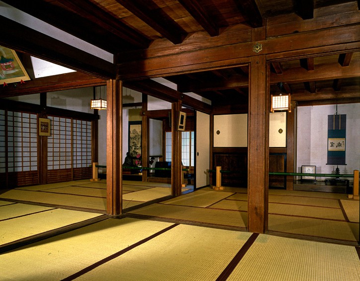 桁行8間、梁間5間の入母屋作りで柿葺(こけらぶき)。12畳半2室、17畳半2室、10畳2室が
