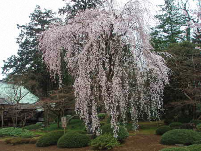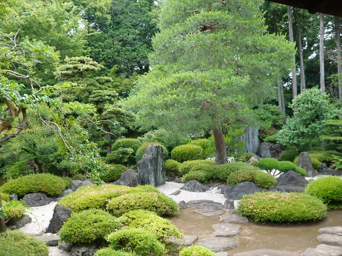 植栽である五本の役木は、真、副、控、受、留の基本に従って植え込まれ、飛石は手前より