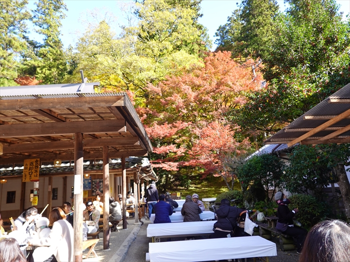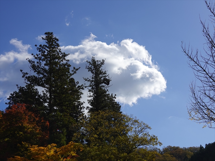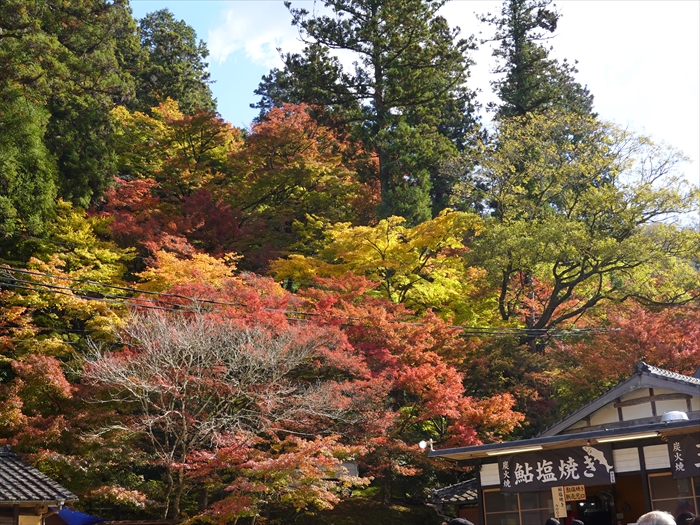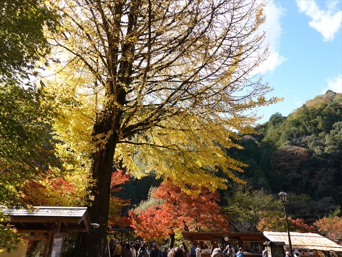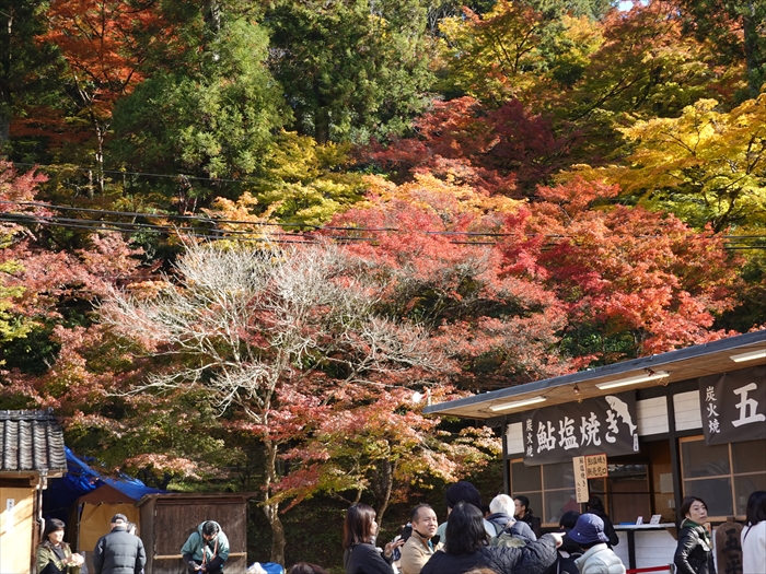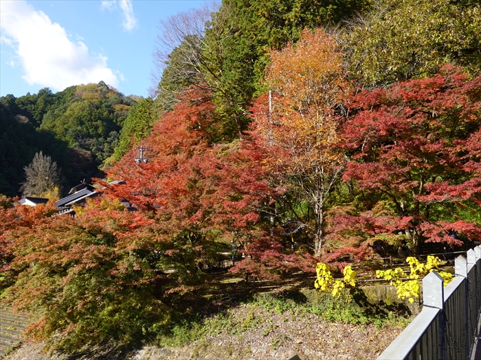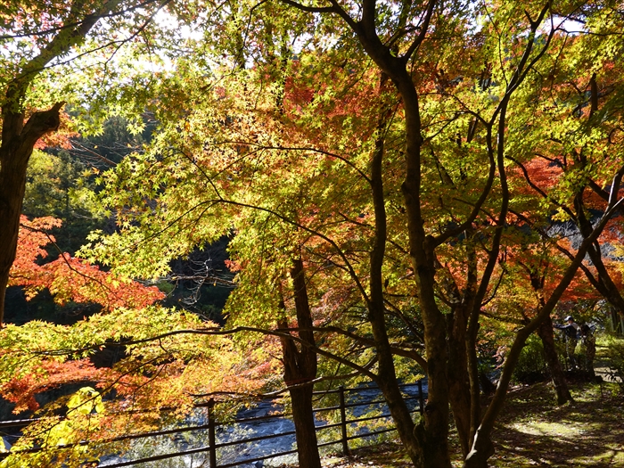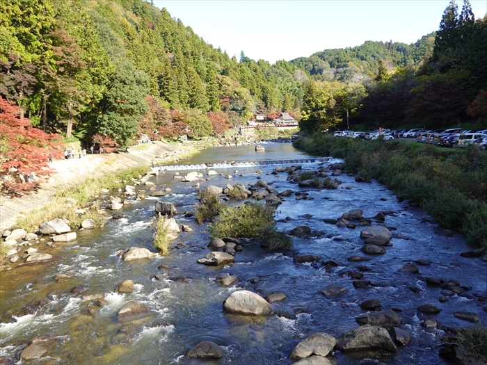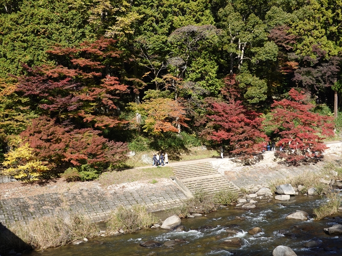 「香嵐渓広場」から飯盛山の麓の紅葉を見上げて。