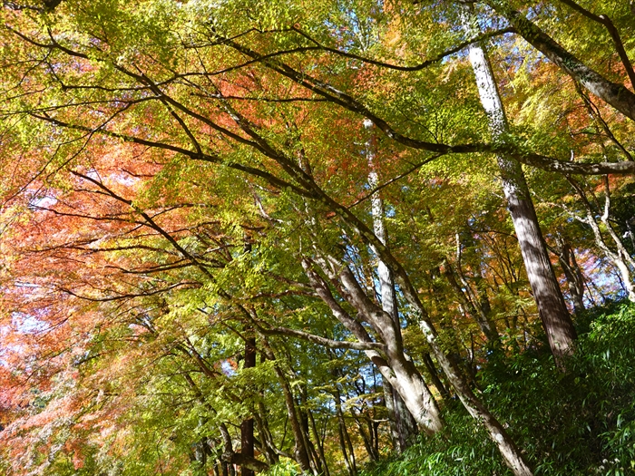 若い緑が鮮やかな紅葉を包み込むように彩りを添え、互いの色が引き立て合いながら、