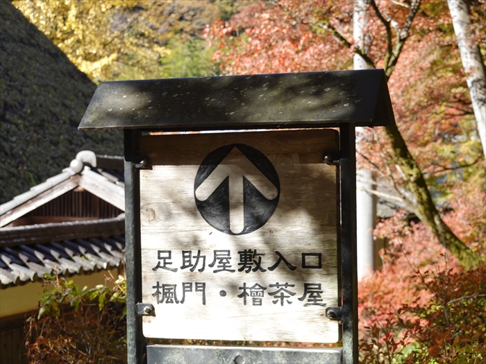 ↑足助屋敷入口 楓門・檜茶屋 」案内板。