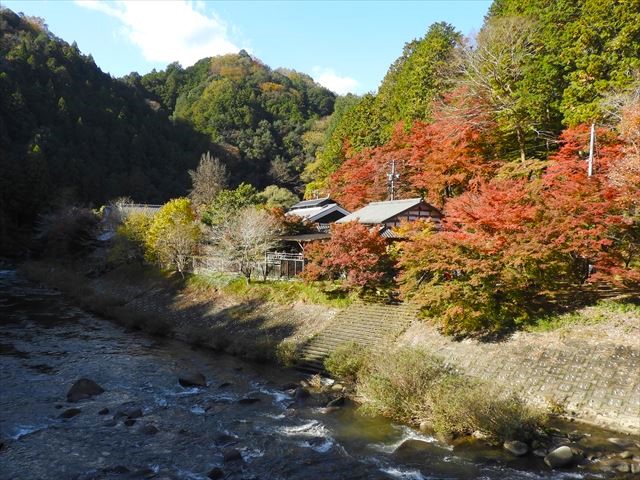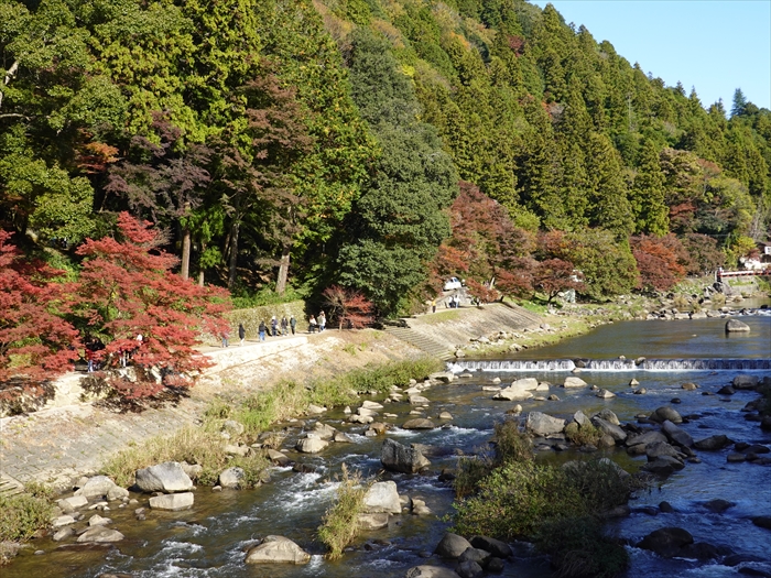 薫楓橋 」を渡りながら、「巴川」の対岸の紅葉を見る。