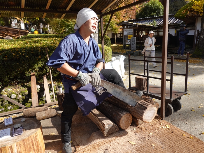 若い「 炭焼き職人 」の姿が「がんど鋸」を持って。