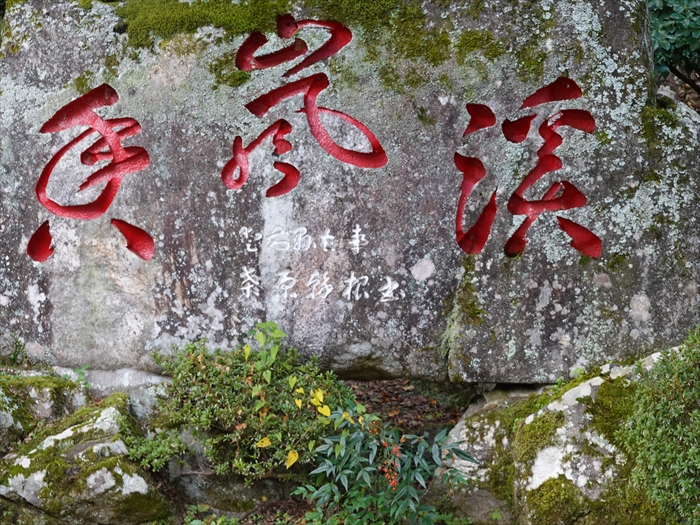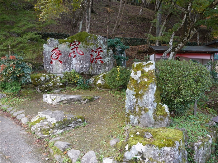 香嵐渓 」と赤く書かれた大きな苔生した石碑。