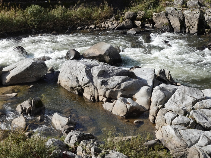 景観を見ることができます。足助川沿いには、川岸に高く築いた石積みの上に、離れや土蔵が