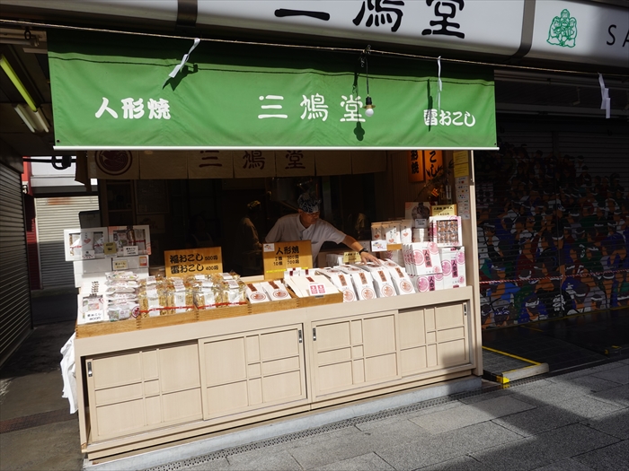 人形焼 三鳩堂 」は既に開店準備中であった。