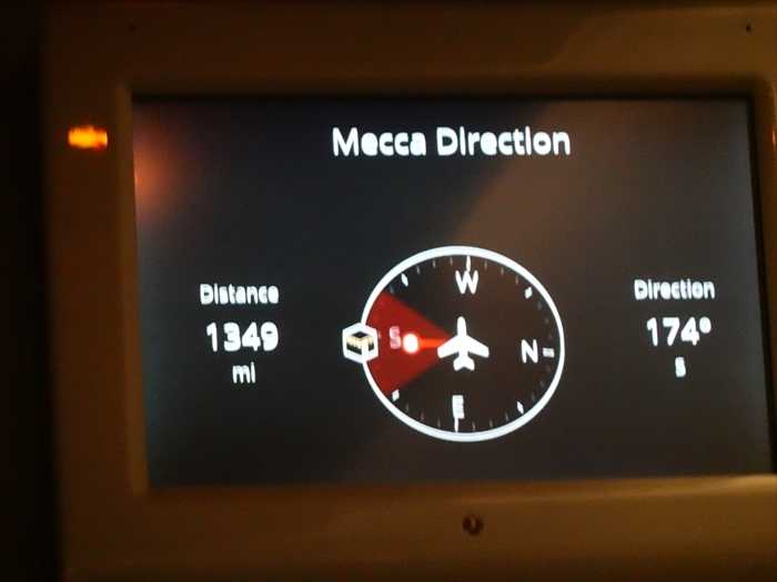 機内の画面には メッカ(Mecca)の方向・距離 が示されていた。
