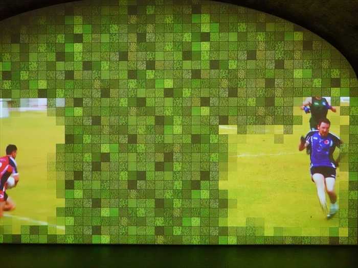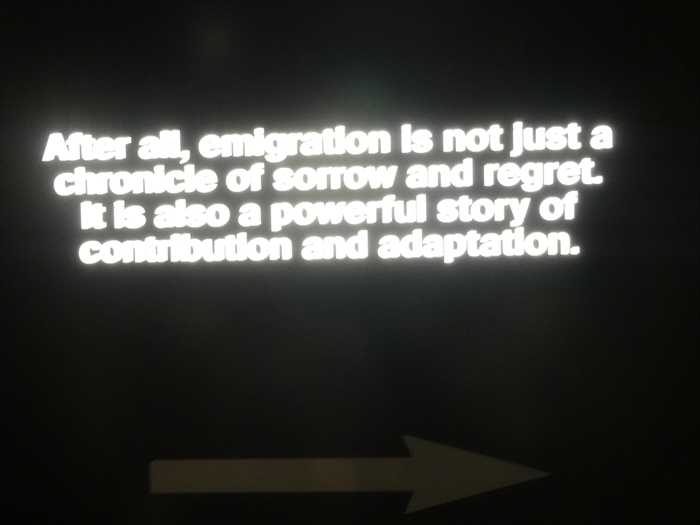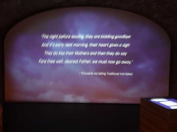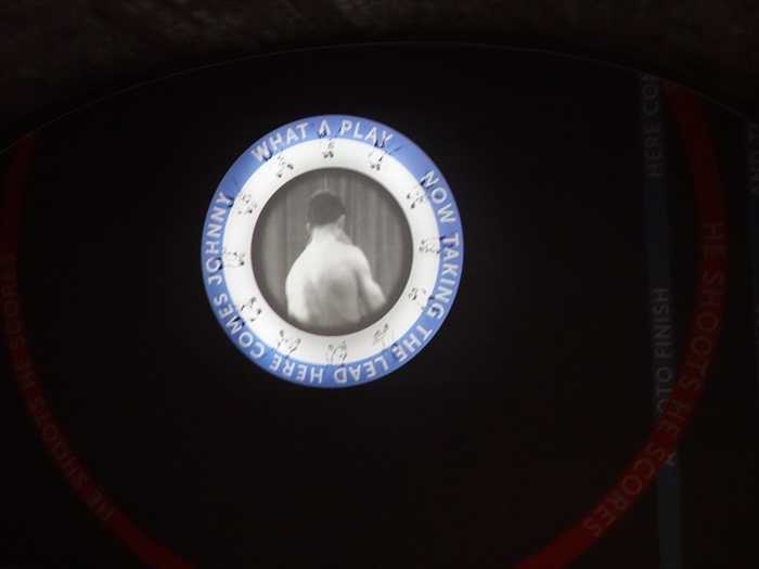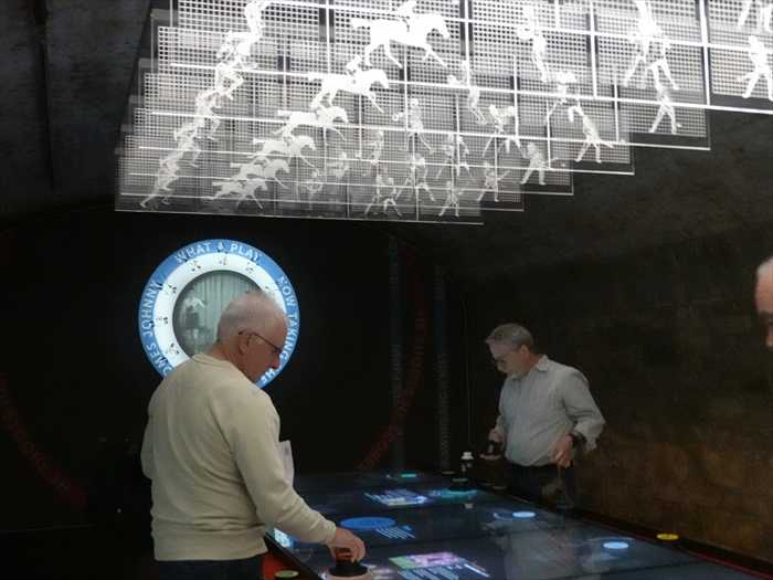 アイルランド系移民のスポーツ分野での功績や文化的影響を紹介する一場面。 「WHAT A PLAY · NOW TAKING THE LEAD · HERE COMES JOHNNY」 【なんというプレーだ! いまリードを奪った! ジョニーが来たぞ!】 「スポーツと移民の功績」セクションの一部であっただろうか?