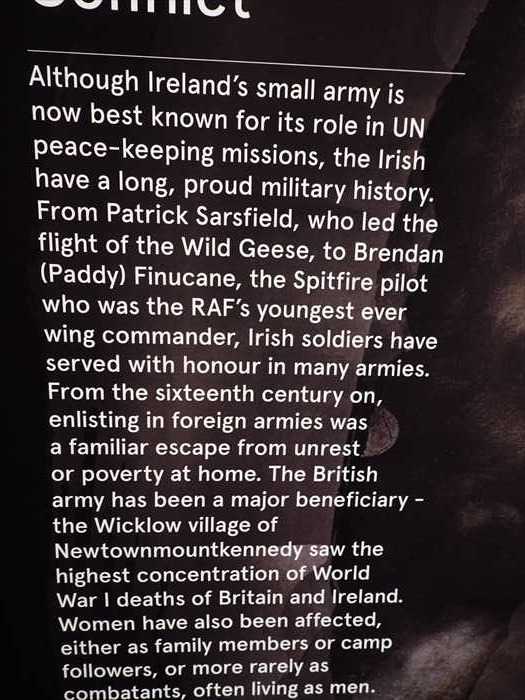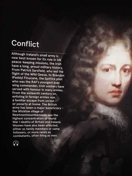 「Conflict Although Ireland's small army is now best known for its role in UN peace-keeping missions, the Irish have a long, proud military history. From Patrick Sarsfield, who led the flight of the Wild Geese, to Brendan (Paddy) Finucane, the Spitfire pilot who was the RAF's youngest ever wing commander, Irish soldiers have served with honour in many armies. From the sixteenth century on, enlisting in foreign armies was a familiar escape from unrest or poverty at home. The British army has been a major beneficiary – the Wicklow village of Newtownmountkennedy saw the highest concentration of World War I deaths of Britain and Ireland. Women have also been affected, either as family members or camp followers, or more rarely as combatants, often living as men.」