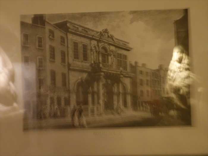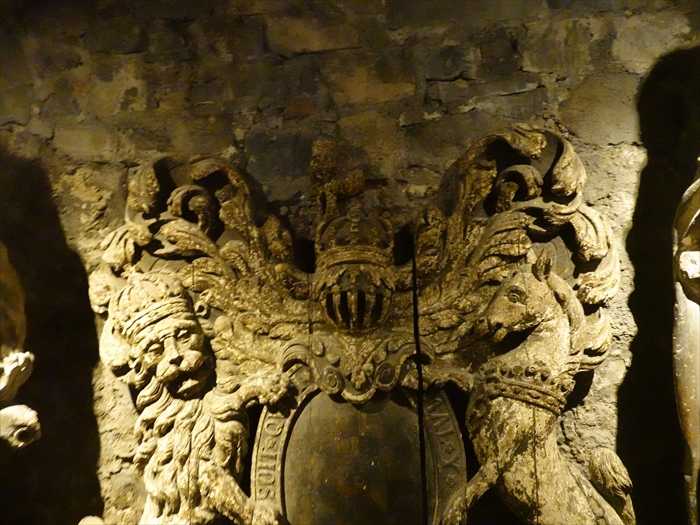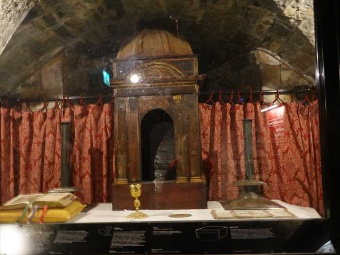 The plain brass candlesticks and the wooden tabernacle – for keeping the consecrated bread and wine – used by Father Stafford during this mass can be seen in the case to your left. Little did Father Stafford or James II know that the elaborate church plate usually used was buried under a coffin beneath their feet.」