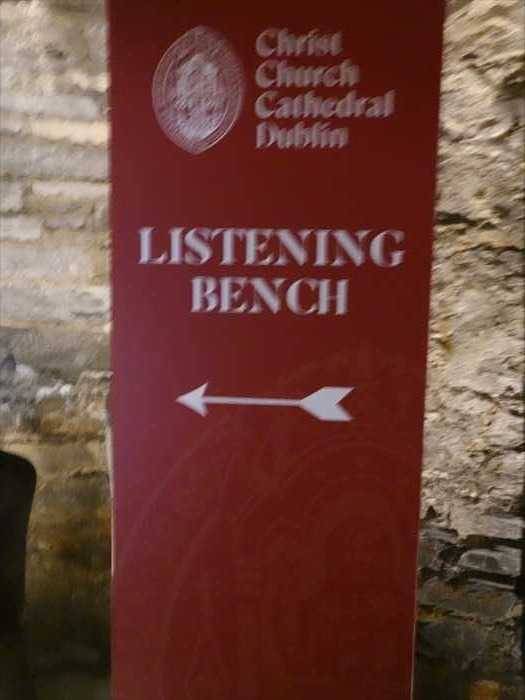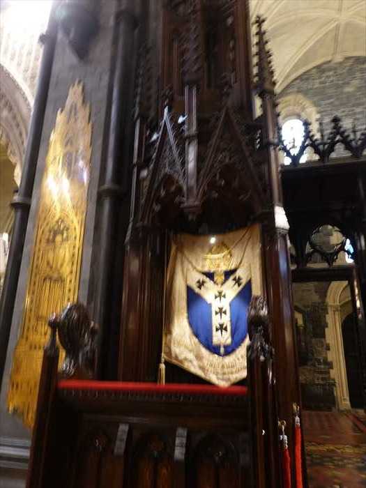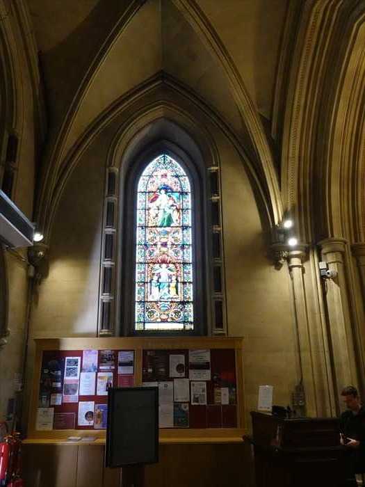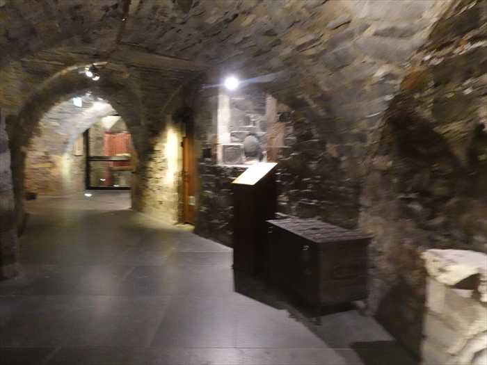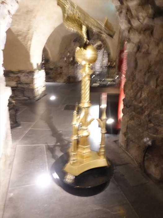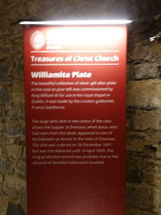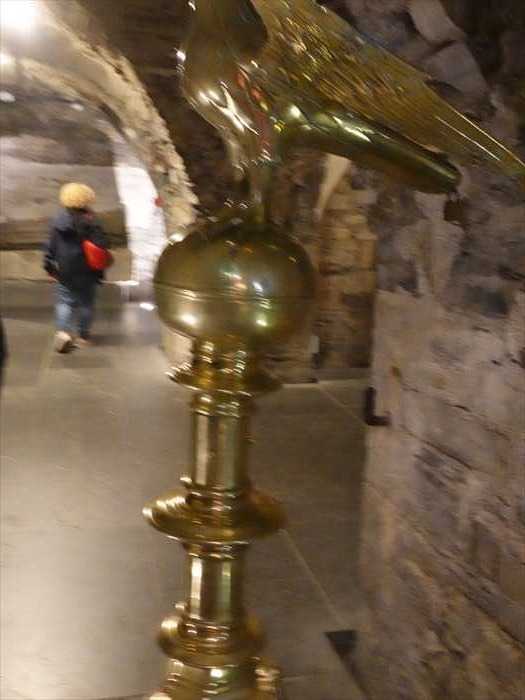 ・さらに奥に見えるガラスケース内の赤い布の展示は、クリプト内の宝物展示コーナー (Treasures of Christ Church)の一部。